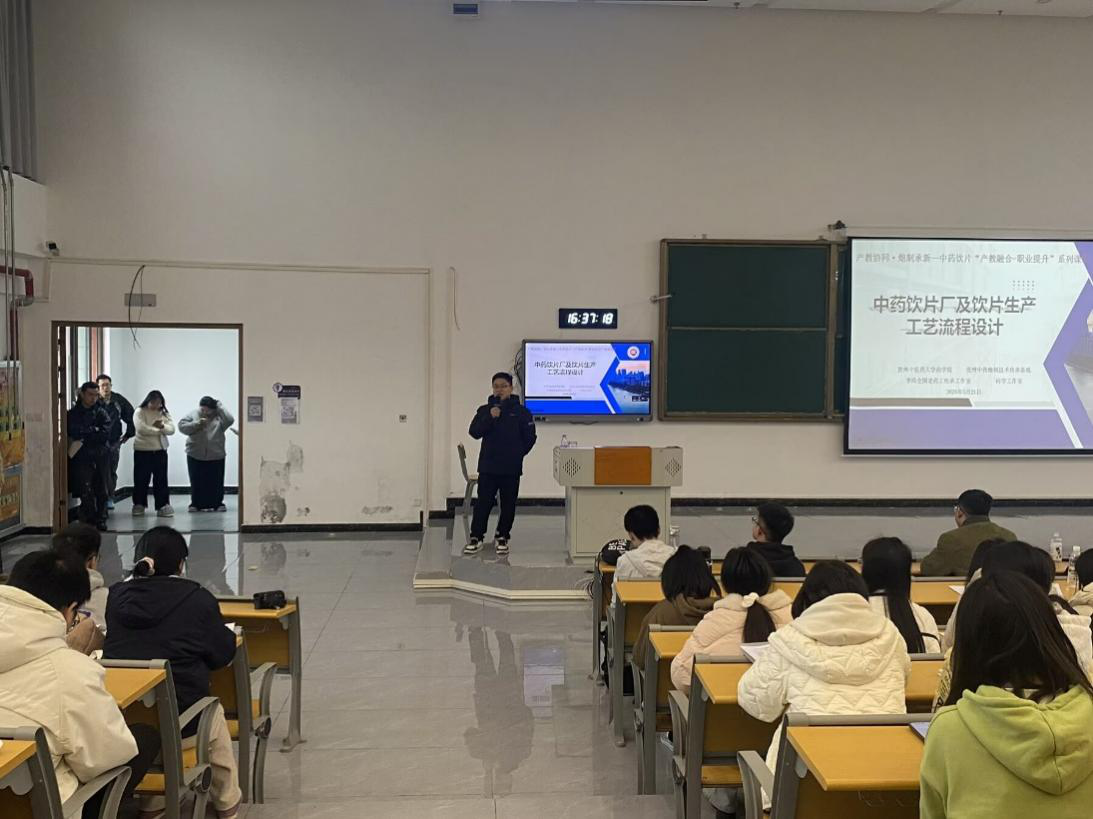 为深化产教融合、推动中药炮制技术传承创新,由贵州中医药大学药学院、贵州中药炮制技术传承基地、李玮全国老药工传承工作室和问学工作室联合主办的“中药饮片厂设计及工艺流程”专题讲座于3月21日下午顺利举行。由中药炮制教研室副主任吴珊珊副教授主持,特邀贵州同济堂中药饮片有限公司生产部门负责人彭华担任主讲,近400名中药学及相关专业本科生和研究生参与了讲座。