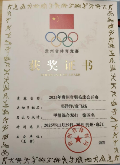 近日,贵州省羽毛球公开赛在贵州麻江马鞍山体育生态公园圆满落幕。本次比赛吸引了来自全省各地的409名羽毛球运动员同台竞技。我院2025级中药资源与开发班袁飞扬同学在激烈角逐中奋勇争先,最终荣获“甲组混合双打第四名”的优异成绩。