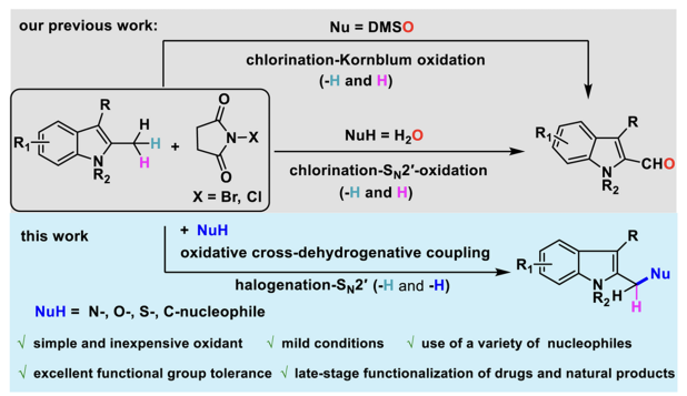 吲哚类骨架是众多中药民族药活性成分、天然药物先导物的核心母核结构,其结构修饰与官能团化是提升药物活性、优化成药性的关键环节。而C(sp³)-H键的直接官能团化反应一直是有机化学领域一项具有挑战性的转化。延续本课题组对吲哚绿色氧化反应的研究兴趣,本文进一步探索了在简单试剂NXS促进下,未活化的2-甲基吲哚苄位C(sp³)-H键与氮、氧、硫及碳亲核试剂的直接官能团化反应,该过程基于氧化交叉脱氢偶联策略得以实现。相较于前期研究方法,本技术路径通过卤代活化与SN2'亲核取代串联反应完成,具备底物适用范围广、官能团兼容性优异、反应条件绿色温和等核心优势,为复杂中药民族药活性成分、氨基酸类天然产物及临床药物分子的后期精准修饰提供了全新的绿色合成方案,填补了相关领域的技术空白。